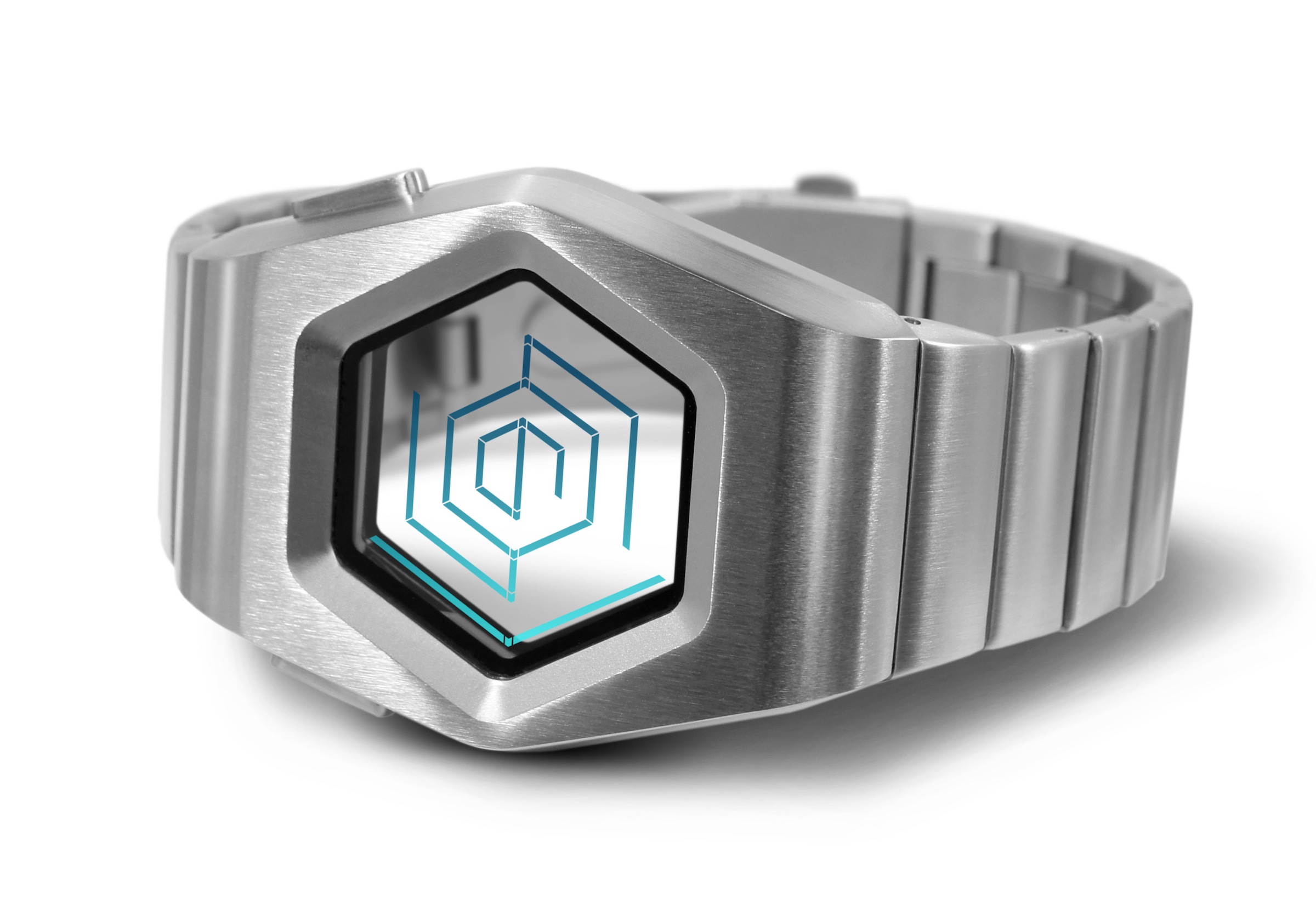 L’heure est affichée sur un écran LCD hexagonal transparent, de façon intuitive et originale.
