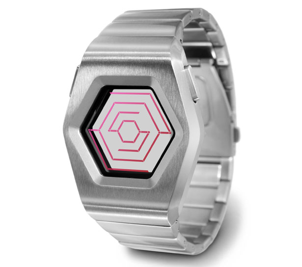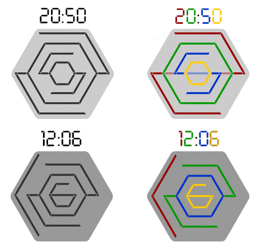 4 annaux hexagonaux indiquent l’heure à 4 unités (heures et minutes) du plus large au plus petit, de l’extérieur vers l’intérieur ou le centre.